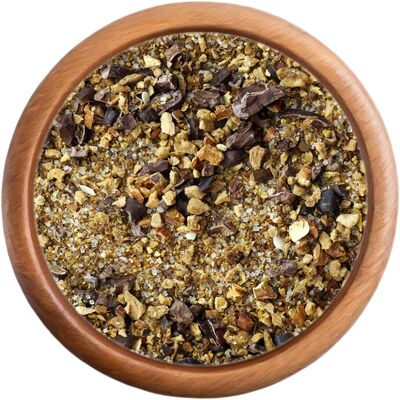 Ez a fűszer egy édes és illatos keverék, amely egyedi ízt kölcsönöz desszerteinek. A kókuszcukrot és a nádcukrot ötvözi a természetes édesség érdekében, almadarabokkal és kakaószeletekkel kiegészítve. A narancshéj friss citrusos hatást ad, amely tökéletesen kiemeli a gofri, palacsinta vagy más édes finomság ízét.